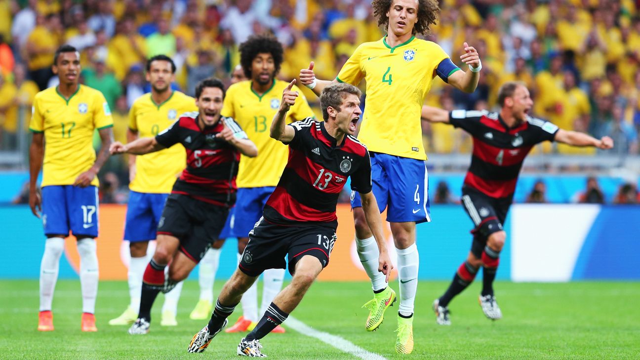 Share all sharing options for: 9:00pm, tuesday 8th july 2014. It's a bloodbath in brazil; That match will go down in football legend and it was voted the greatest world cup moment of all time Tpx images of the day soccer sport world cup). Muller crossed it to mesut. The players are out on the pitch, so we should be underway shortly. By phil mcnultychief football writer in belo horizonte. {{ mactrl.hometeamperformancepoll.totalvotes + mactrl.awayteamperformancepoll.totalvotes }} votes. For germany, it holds significant memories, but it resulted in humiliation for brazil. Germany has succeded in spelling brazil. Brazilian friends watching germany vs brazil in the 2014 world cup semifinal game rights: Germany's miroslav klose just became the top scorer in the tournament's history with his 16th goal.